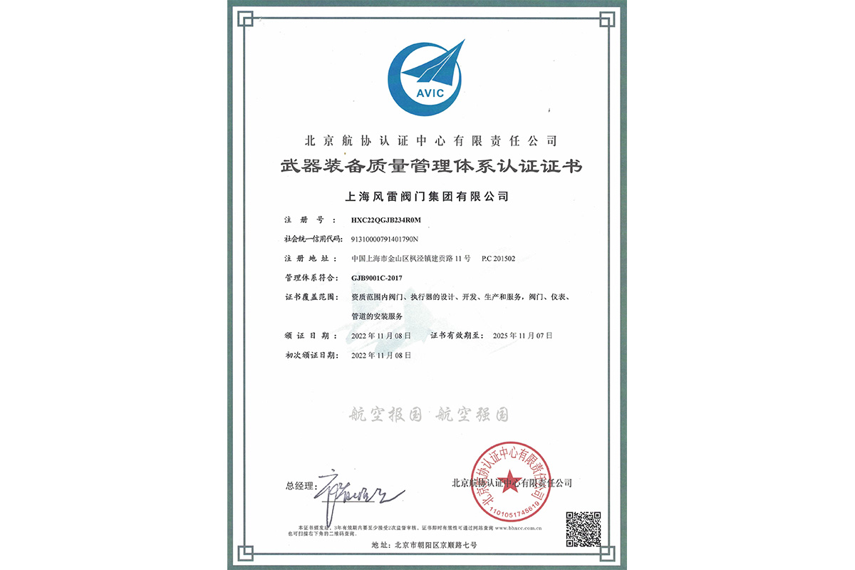 GJB9001C國(guó)軍標(biāo)質(zhì)量體系證書